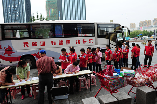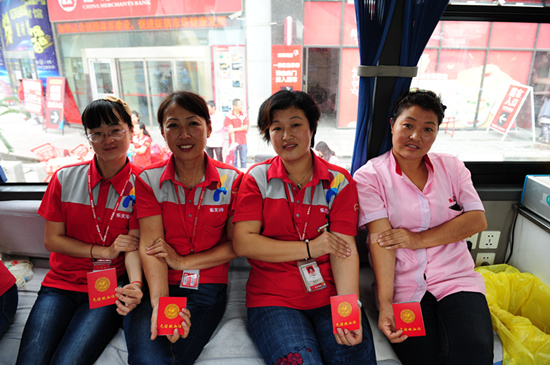 阴沉的天气没有挡住爱心的涌动,早 8点献血车就开到了经区乐天玛特超市门口,已经有不少员工在楼下等候。史淑红大姐自告奋勇第一个上,为这次活动开了好头。史大姐掏出的献血证上密密麻麻的记满了她多次献血的历程,她说:“我已经坚持了好多年了,我觉得献血对我的身体挺好的,还奉献了爱心,多好的事情啊!”林经理已经是10年的老献血者了,他说:“我献血就觉得它是件好事,能帮上别人的忙,这就够了。前几天看到血站库存较低,和领导聊天的时候聊起,领导就很支持这次奉献爱心的活动,也是作为我们企业为祖国生日准备的礼物了。”
